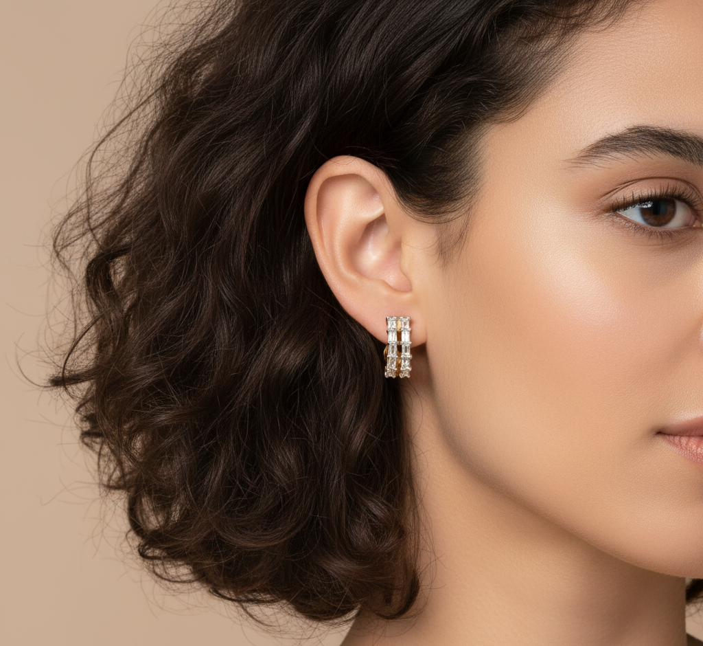 Elevate your everyday elegance with these 14K Gold Plated Silver Baguette Moissanite Huggie Earrings, crafted for women who love timeless sparkle with modern luxury. Each huggie features prong-set baguette-cut Moissanite stones (approx 1CTW) that deliver diamond-like brilliance from every angle.