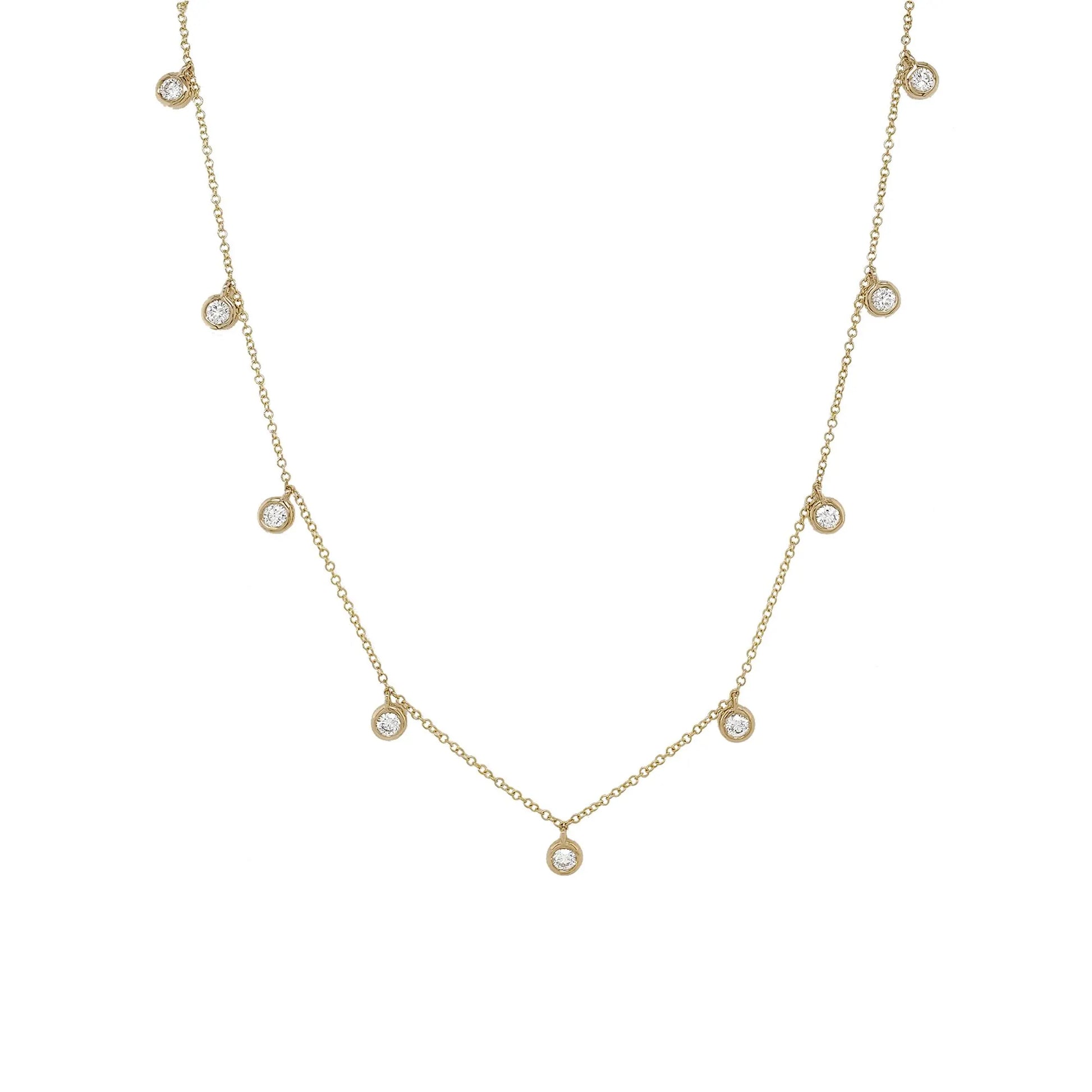 The Moissanite Diamond Station Necklace in Gold plated silver is the epitome of elegance and sophistication in the world of fine jewelry. This exquisite piece features a captivating array of shimmering moissanite diamonds delicately set along a sleek chain, creating a dazzling display of beauty. The dangling bezel design adds a touch of modern flair, making it a versatile accessory for any occasion.